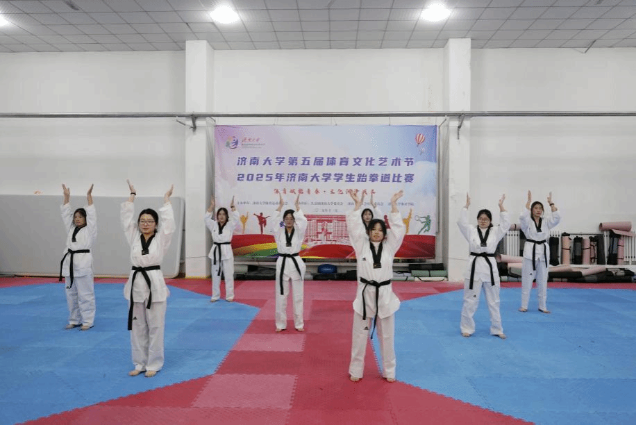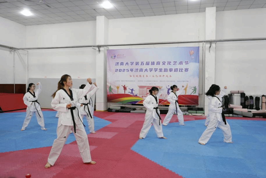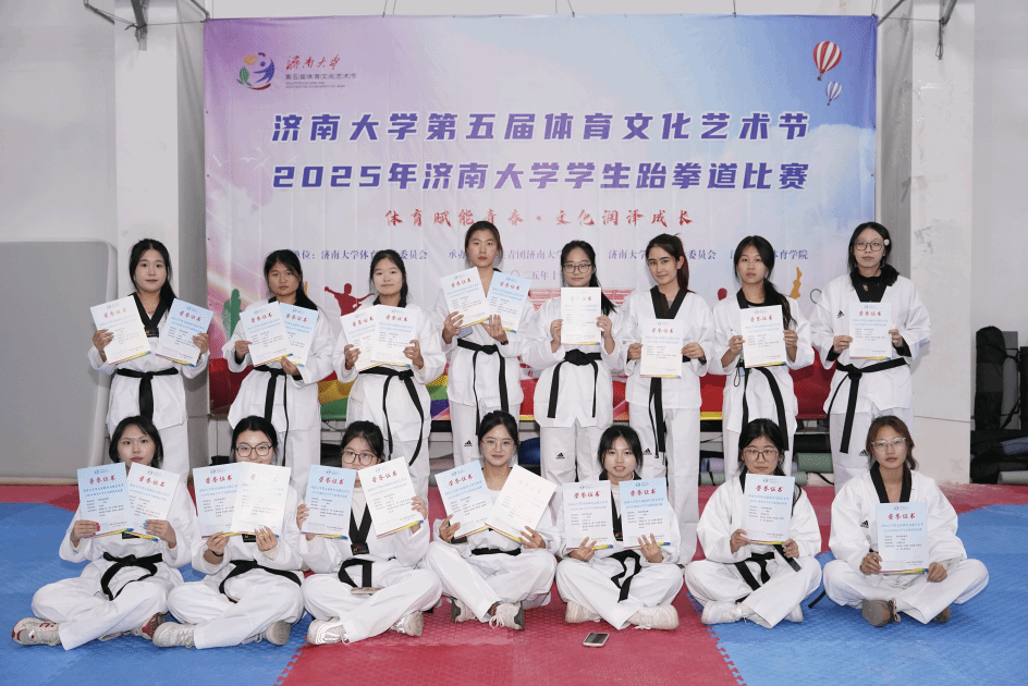 为响应全民体育号召,丰富校园文化生活,11月17日,济南大学2025年学生跆拳道大赛在主校区三食堂二楼跆拳道、瑜伽馆拉开帷幕,文学院积极参赛,取得了规定团体品势及团体跆拳道舞双项二等奖和团体第四名的好成绩,其中赵婷获跆舞优秀表演奖,刘倩获最佳表演奖,范晶晶获明星队员奖、快腿一等奖,王明玉、张圆圆获规定个人品势二等奖,王明玉、葛馨宇获快腿二等奖,张圆圆、赵欣然、刘倩获快腿三等奖。