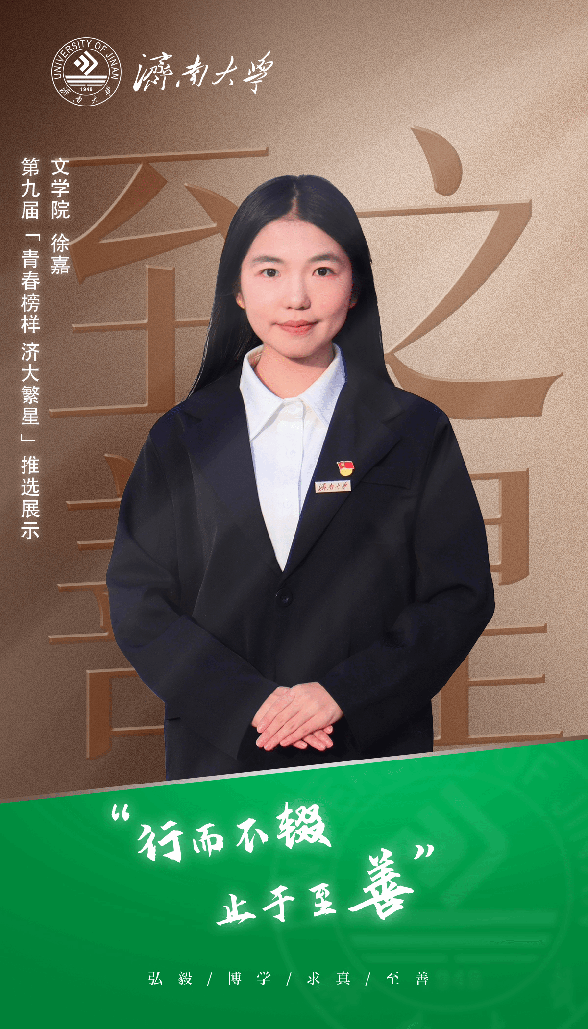 近日,在济南大学第九届“青春榜样·济大繁星”推选活动中,文学院周欣瑶、郭璐瑶、徐嘉荣获“济大繁星”称号。周欣瑶、郭璐瑶同时荣获“润生生涯奖助学金”。