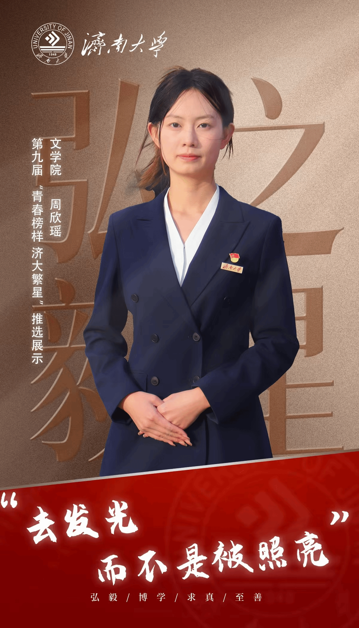 周欣瑶,女,中共党员,文学院广告2202班班长,现已推免至华中师范大学攻读硕士研究生。曾任济南大学融媒体中心摄影部主席、济南大学招生办公室新媒体中心副主席。