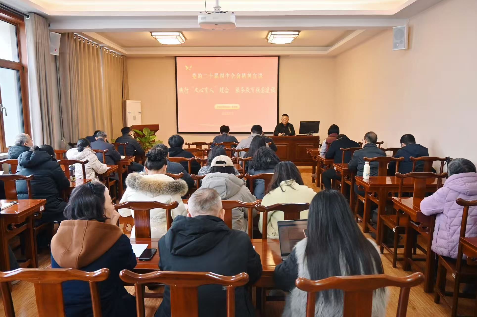 为深入学习贯彻党的二十届四中全会精神,凝聚思想共识,明确使命担当,12月23日,文学院党委在三教舜耕书院开展学习贯彻党的二十届四中全会精神宣讲。文学院党委书记朱海龙以《践行“文心育人”理念 服务教育强国建设》为题讲授专题党课,学院全体教职工党员参加学习。