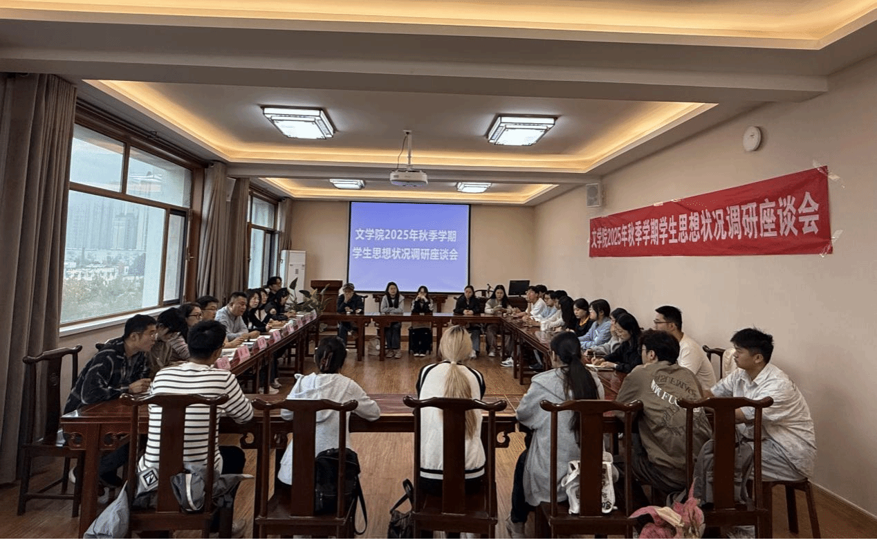 为全面了解新学期学生的思想动态及学习生活需求,进一步增强学生思想引领工作的针对性、时效性与主动性,近日,文学院在第三教学楼419室专题召开2025年秋季学期学生思想状况调研座谈会。学院党委书记朱海龙,党委副书记、副院长潘颖出席会议,全体辅导员,教学管理办公室相关工作人员,以及各年级学生代表共同参与座谈会。