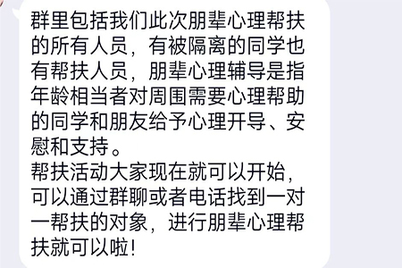 活动开始前,学院心理协会工作人员有条不紊、分工明确,顺利完成前期宣传活动,确定了隔离同学和帮扶人员,同时也明确了活动日期、形式等工作。活动过程中,帮扶人员通过私聊或打电话的方式积极为一对一帮扶同学进行朋辈心理辅导,从活动开始到活动结束,隔离同学寻求帮助,帮扶人员耐心答疑,参与人员全心投入,圆满完成各项任务,达到了预期的活动效果。