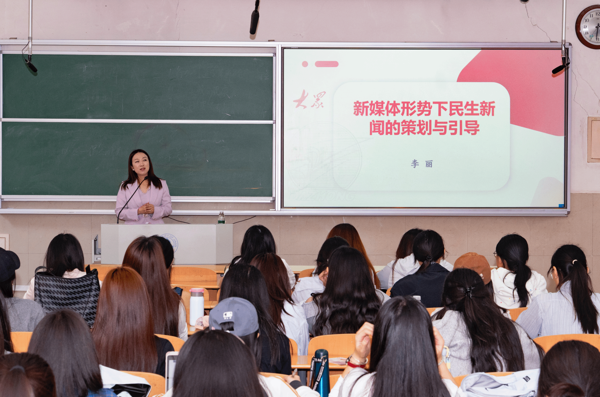 4月17日下午,文学院广播电视学专业“媒体人进校园” 系列讲座首场活动顺利举办。本次活动以“生涯面对面”为核心形式,特邀大众日报卫生记者站站长、大众日报大众健康版主编、健康山东云平台总监李丽,为2024级广电专业学生带来主题为《新媒体形势下民生新闻的策划与引导》的认知实习讲座。讲座由薛梦晨、丁捷老师主持。