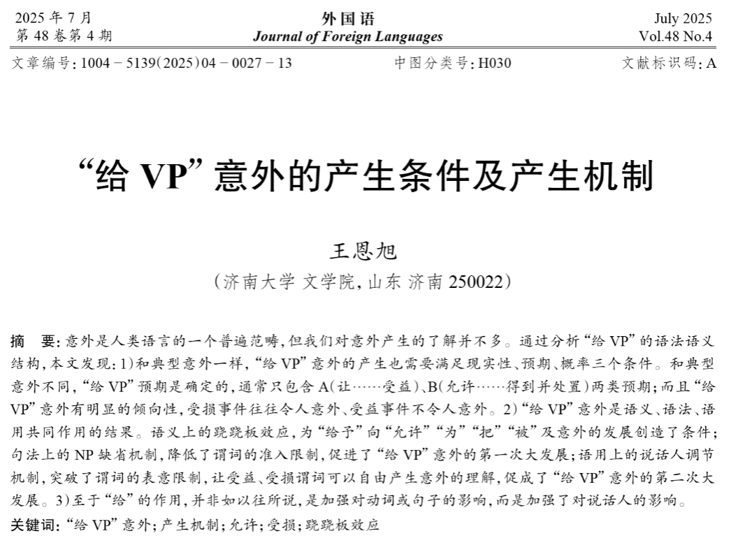 近日,我院王恩旭教授在《外国语》(CSSCI)2025年第4期上发表学术论文《“给VP”意外的产生条件及产生机制》。该论文系国家社科基金项目“汉语词的模板式释义方法及释义模板库建设研究”(项目号:19BYY030)的重要阶段性成果。